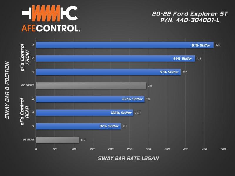 Dramatically reduce body roll without sacrificing ride quality with aFe CONTROL’s Sway Bar Set designed for the 20-22 Ford Explorer ST 3.0L V6 (tt). This set includes 3-way adjustable front & rear sway bars to help you fine-tune the handling balance of your ST. The result? Sharpened steering response for improved initial turn-in, enhancing the overall agility of your Explorer.