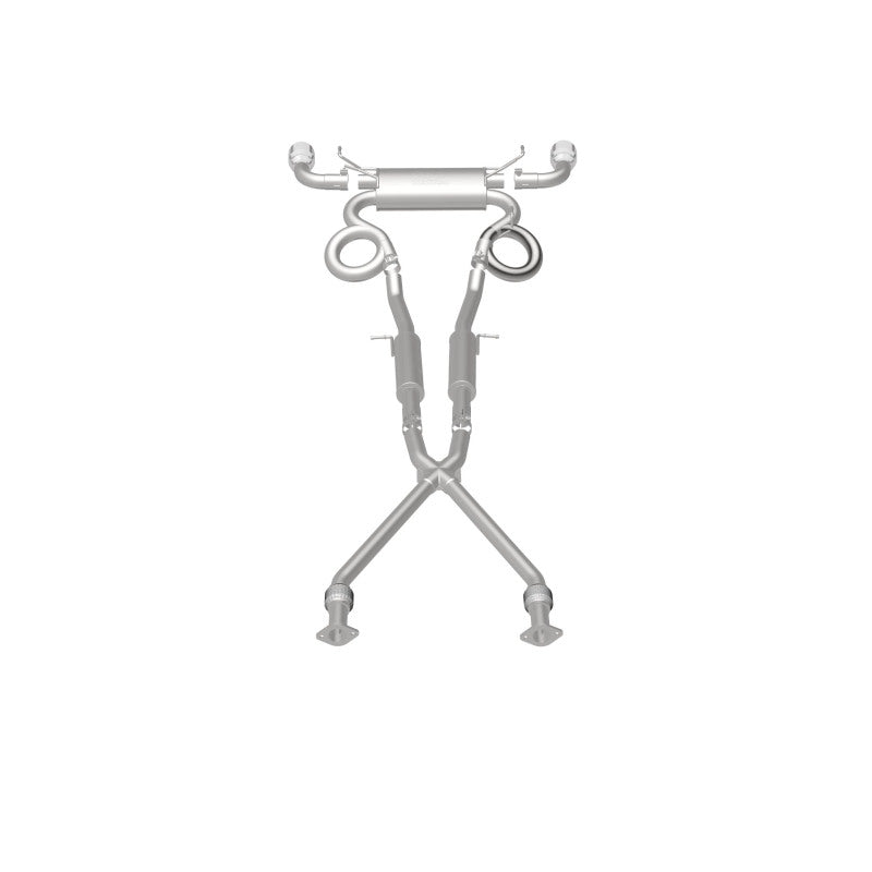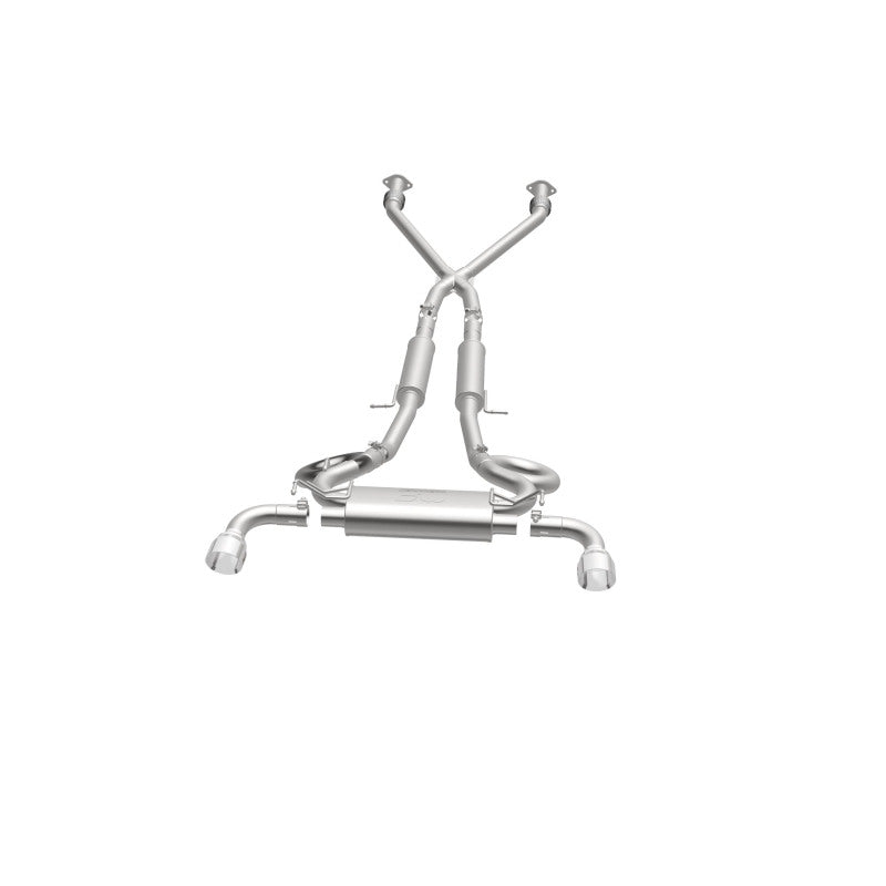 Designed to enhance performance, this cat-back exhaust system optimizes exhaust flow and improves sound quality for a more dynamic driving experience. With a robust design featuring mandrel-bent piping, it effectively reduces back pressure while producing a deep, resonant tone that resonates with automotive enthusiasts. The dual split rear exit configuration provides an aggressive look that complements the sporty aesthetic of the vehicle.