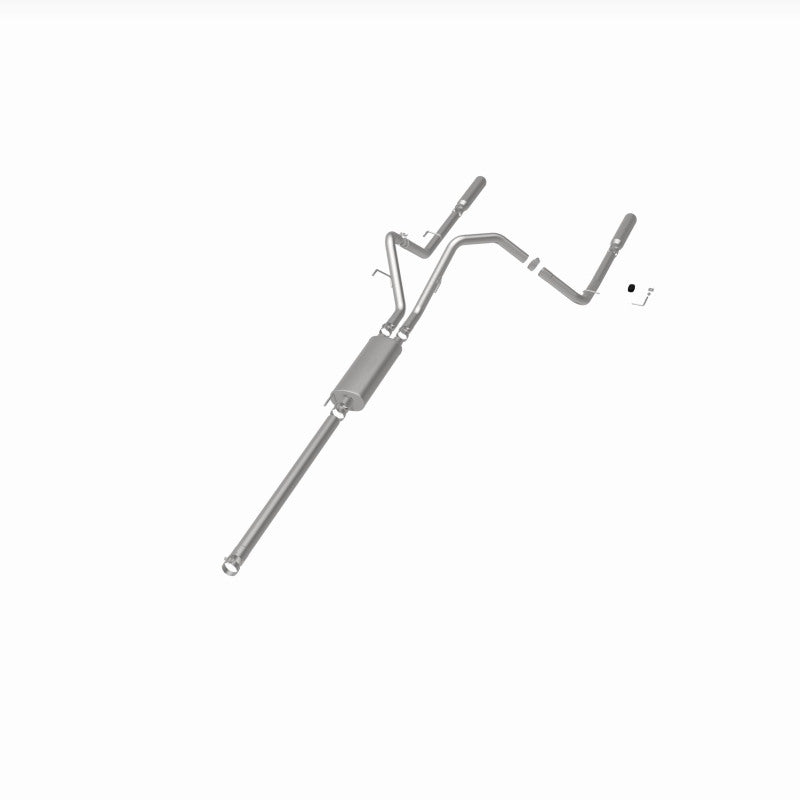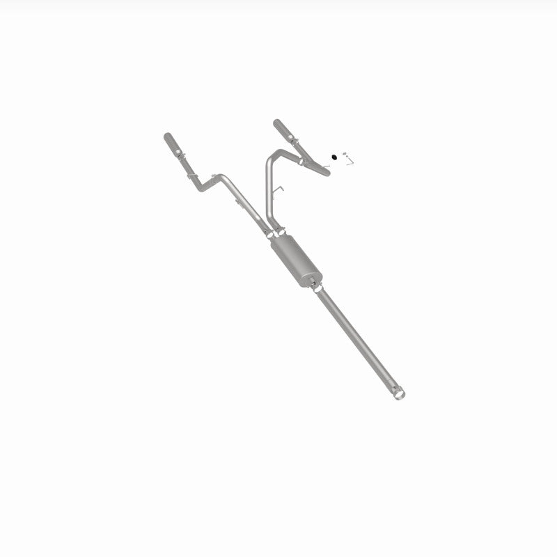 The performance exhaust system enhances the engine sound and overall vehicle efficiency for the specified model. Featuring fast-flowing, mandrel-bent 3-inch main piping combined with a straight-through muffler design, this system provides a potent exhaust note that resonates with power. Its dual split rear exit design is complemented by polished 3.5-inch clamp-on single wall angle cut rolled edge tips, delivering a sporty appearance that catches the eye.