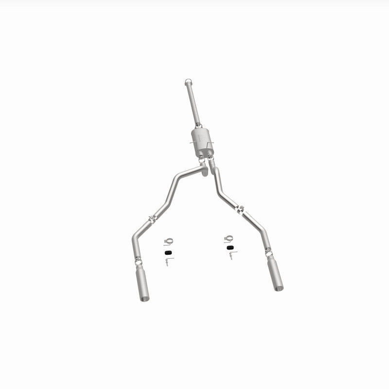 The MagnaFlow Street Series Cat-Back Performance Exhaust System 15749 enhances the performance and sound of your Ford vehicle. Designed for 4.6L and 5.4L engines from 1997 to 2004, this exhaust system delivers a resonant and powerful engine tone while providing proven performance gains. Crafted with mandrel bent 2.5in. main piping and Straight-Through mufflers, this kit features a Dual Split Rear exit with 3.5in. Polished Clamp-On Single Wall Angle Cut Rolled Edge tips, offering both style and functionality.