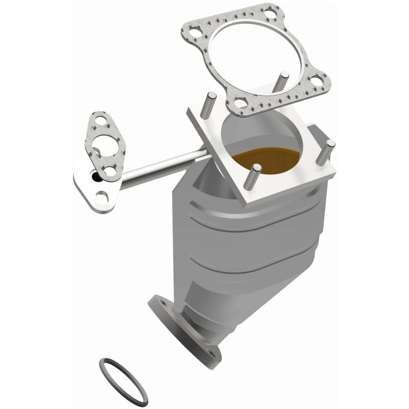 This direct-fit catalytic converter is designed to enhance exhaust flow efficiency while ensuring compliance with Federal emissions standards. Its construction features mandrel-bent tubing that eliminates flow restrictions, promoting optimal performance. The durable stainless steel build provides resistance against corrosion, ensuring longevity and reliability in various driving conditions.