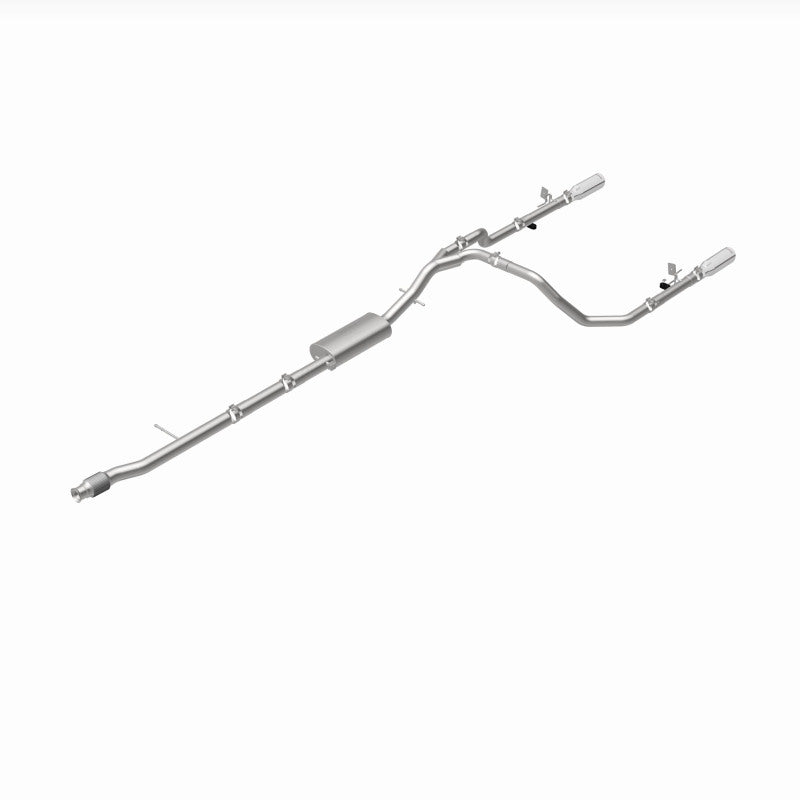 This performance exhaust system enhances the vehicle's exhaust flow and delivers an aggressive sound profile while ensuring a significant boost in power. Designed with mandrel-bent 3-inch main piping and straight-through mufflers, it facilitates superior exhaust efficiency and performance. The dual split rear exit configuration, featuring polished 4-inch double wall angle cut rolled edge tips, not only complements the sporty aesthetic but also provides a resonant engine tone that commands attention.
