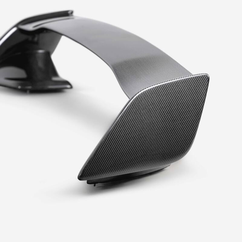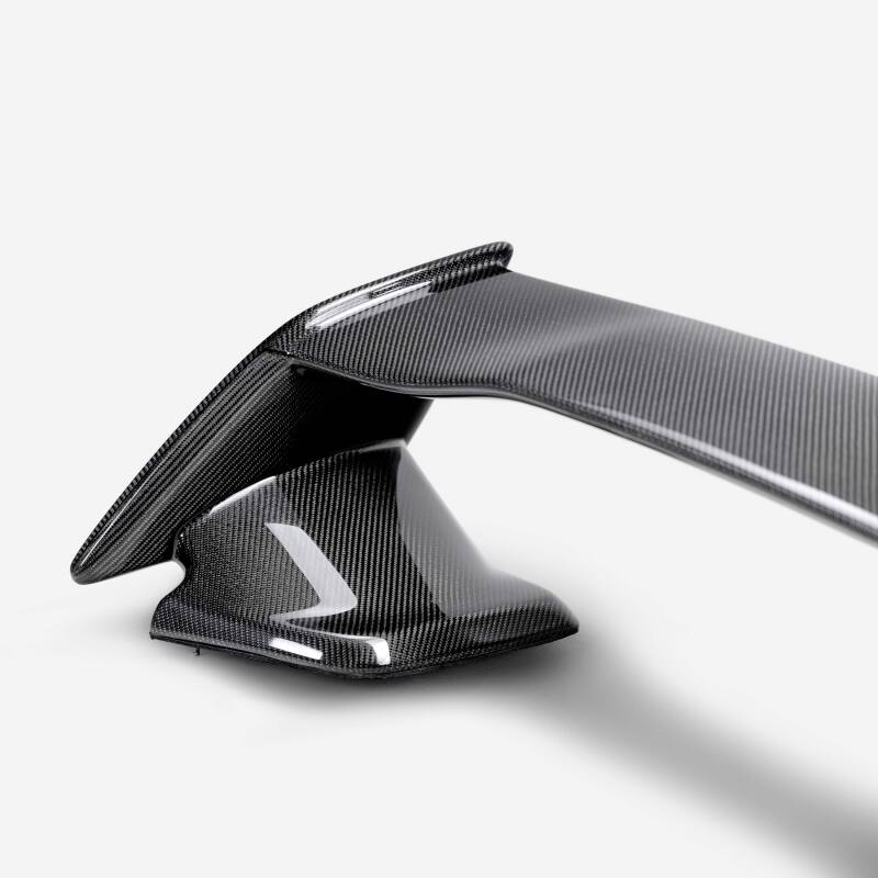 The rear spoiler enhances aerodynamic efficiency and stability at high speeds, improving overall handling and performance. Crafted from lightweight carbon fiber, it provides a significant reduction in weight compared to traditional materials, ensuring durability without compromising aesthetics. Its sleek design seamlessly integrates with the vehicle's contours, offering an aggressive look that complements the overall styling.